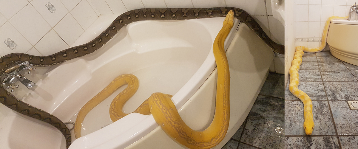 1. Een van mijn pythons had begrepen dat de deur van het terrarium open kan. Nu is dus de hele dag zijn bezigheid om de terrariumdeur proberen te openen. Soms heb ik medelijden met hem, omdat hij zo zielig zit te kijken, terwijl ik tv kijk. Meestal zit hij vrij in het huis. Dan kruipt hij vaak onder het verwarmingselement. Soms vergeet ik helemaal dat hij daar zit. Soms heb ik visite, en dan denk ik "sh.... de slang zit nog onder de bank...." dus ik zeg altijd: “Niet schrikken als je een slang onder de bank ziet. De meeste mensen zeggen dan: "Jajajaja!" maar toch - als ze onder de bank kijken en een 2 en halve meter lange slang ziet - is het wel even schrikken. Een keer stond de verwarming hoog en dan heeft hij lichte brandwonden op zijn huid. Ik heb hem naar de dierenarts meegenomen, omdat ik niet wist wat dat kon zijn...., maar de dierenarts wist het wel: lichte brandwonden, dus heb ik brandwondencrème gekregen. Bij de apotheek lachten ze zich rot, toen ze mij aan zagen komen met het recept: “Brandwondencrème voor slang!”